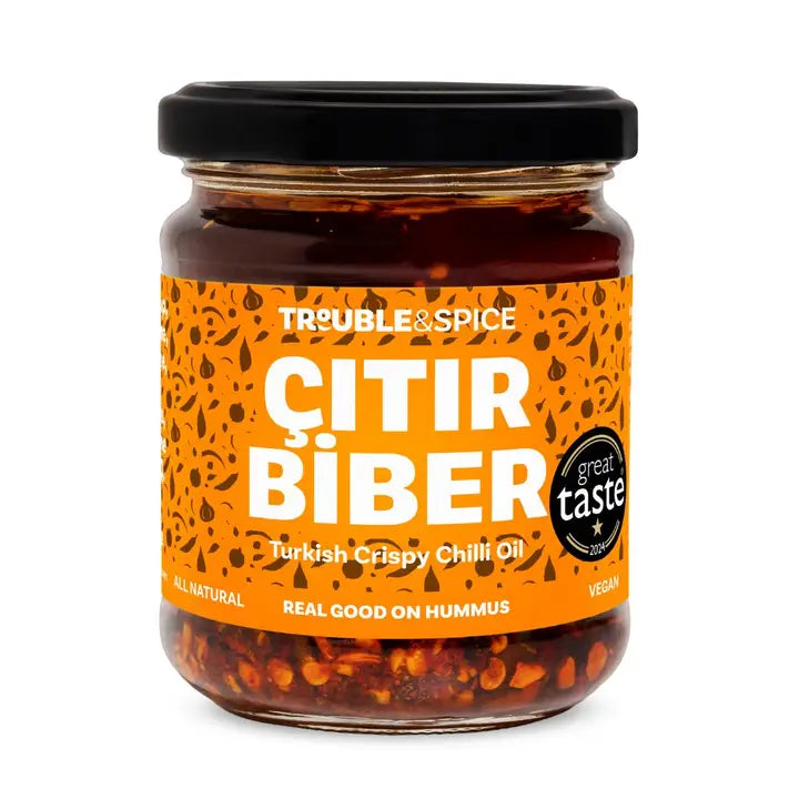 Trouble & Spice Citir Biber est une huile de piment primée (Prix du Goût Exceptionnel 2025 - 2 étoiles) conçue pour sublimer le houmous. Cette préparation croustillante associe pul et isot biber à des pétales de rose, menthe fraîche, graines de coriandre et une subtile note de mélasse de grenade. Polyvalente, elle rehausse également pois chiches, aubergines et grillades. Ingrédients : huile de tournesol, piment, ail, oignon, menthe, graines de coriandre, rose, poudre de grenade, sel.