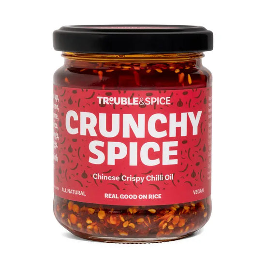 Huile pimentée croustillante d'inspiration chinoise, enrichie d'un mélange savant d'épices : poivre de Sichuan, cannelle, anis étoilé et cinq épices. Cette préparation se distingue par ses éléments texturés addictifs – flocons de piment, cacahuètes, graines de sésame, oignons et ail croustillants – qui créent une expérience sensorielle complète. Versez-la généreusement sur vos nouilles, œufs ou sandwichs à l'avocat pour révéler toute sa complexité aromatique. Une condiment polyvalent qui transforme chaque plat en création culinaire.